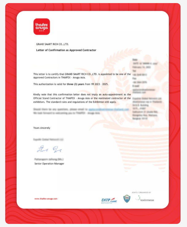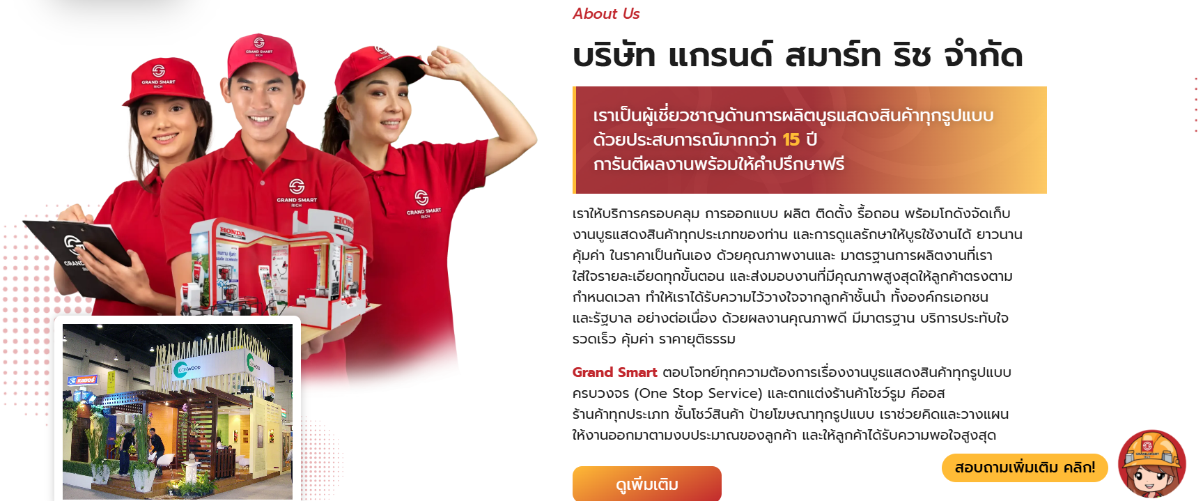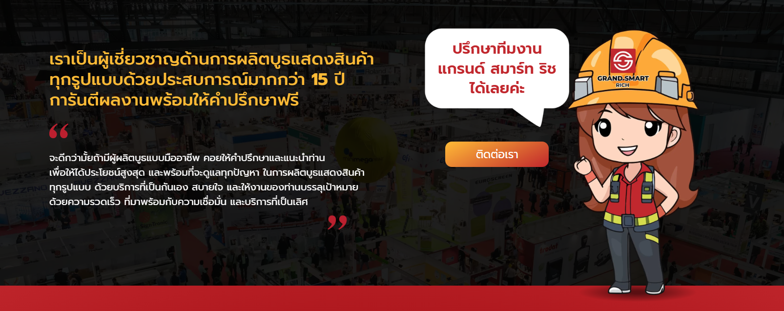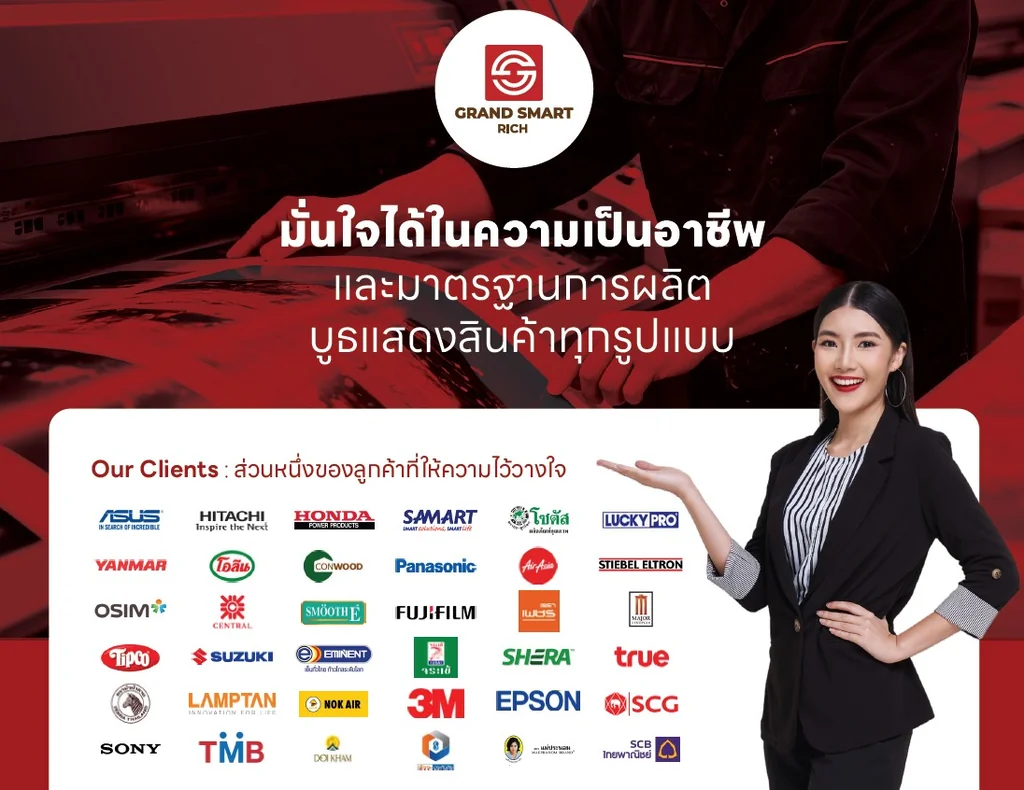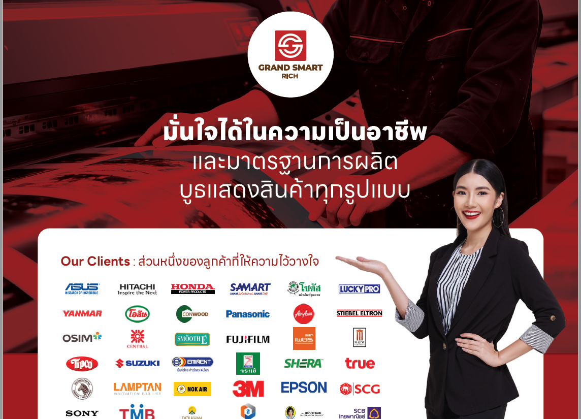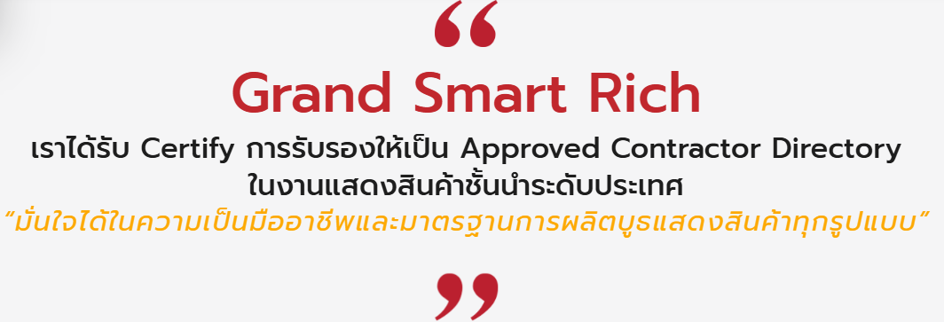 บจก. แกรนด์ สมาร์ท ริช ผลิตบูธแสดงสินค้าและคีออสทุกประเภทมาแล้วมากว่า 2,000 ผลงาน ทำให้เรารู้ความต้องการของลูกค้าเป็นอย่างดี ไม่ว่าจะเป็นเรื่องของงบประมาณที่จำกัด, และปัญหาในระหว่างผลิตที่อาจจะเกิดความผิดพลาดขึ้นได้ทุกเมื่อและไม่ตรงตามสเปกที่กำหนด, รวมถึงการควบคุมค่าใช่จ่ายไม่ให้บานปลายระหว่างผลิตบูธ, และความเชื่อมั่น ความไว้วางใจ ความสบายใจ ที่จะได้รับจากผู้ผลิตงานบูธแบบไร้กังวลทุกเรื่อง ตลอดจนการส่งมอบงานให้ตรงเวลาตามที่นัดหมาย พร้อมกับผลงานคุณภาพ ได้มาตรฐาน ทุกอย่างนี้ คือ ความคาดหวังที่ลูกค้ามีต่อการผลิตงานบูธแสดงสินค้า ที่ต้องการให้บูธนี้ ส่งผลที่ดีให้กับภาพลักษณ์ขององค์การ และเพิ่มประสิทธิภาพทางการขายและการตลาด เพื่อให้บรรลุเป้าหมายตามที่ตั้งไว้ และเกิดความพึงพอใจสูงสุด